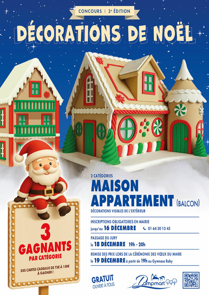 Faites briller Dampmart de mille lumières pour les fêtes ! La municipalité organise son concours de décorations de Noël. 2 catégories : Décorations visibles de l’extérieur uniquement. À gagner : des cartes cadeaux d’une valeur de 75 € à 150 € pour les 3 premiers gagnants de chaque catégorie ! INSCRIPTIONS OBLIGATOIRES EN MAIRIE avant le 16 décembre01 64 30 13 45 Illuminez votre façade, faites parler votre créativité et contribuez à la magie de Noël à Dampmart !